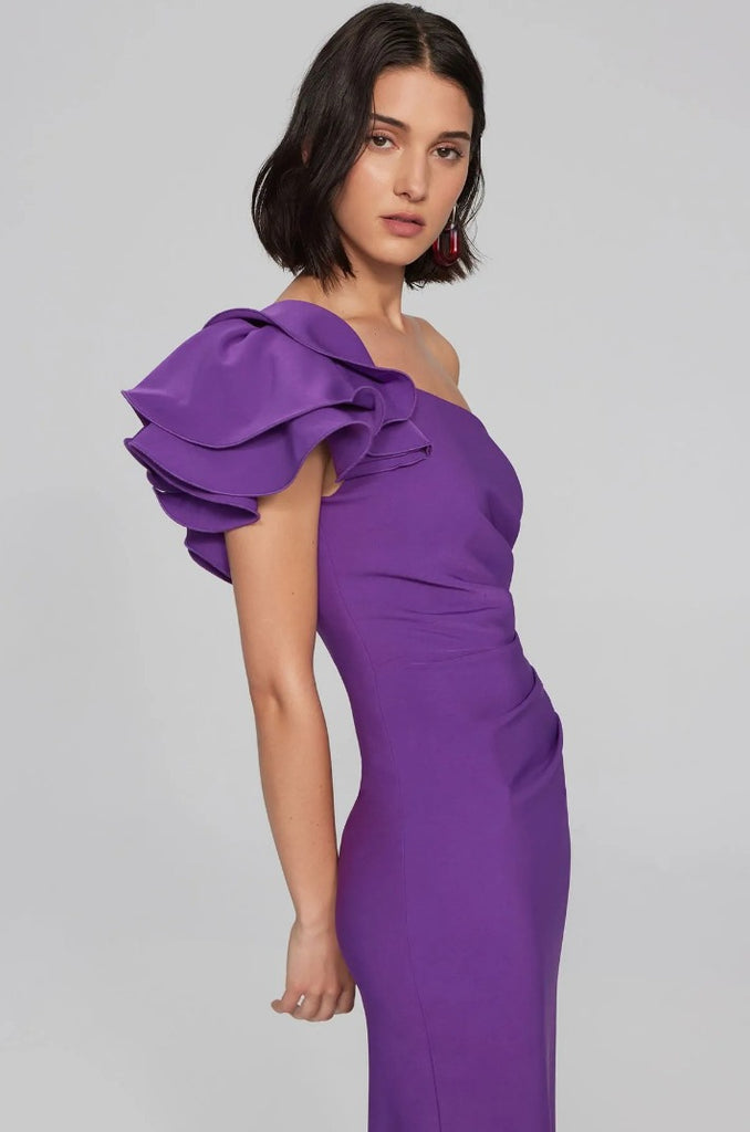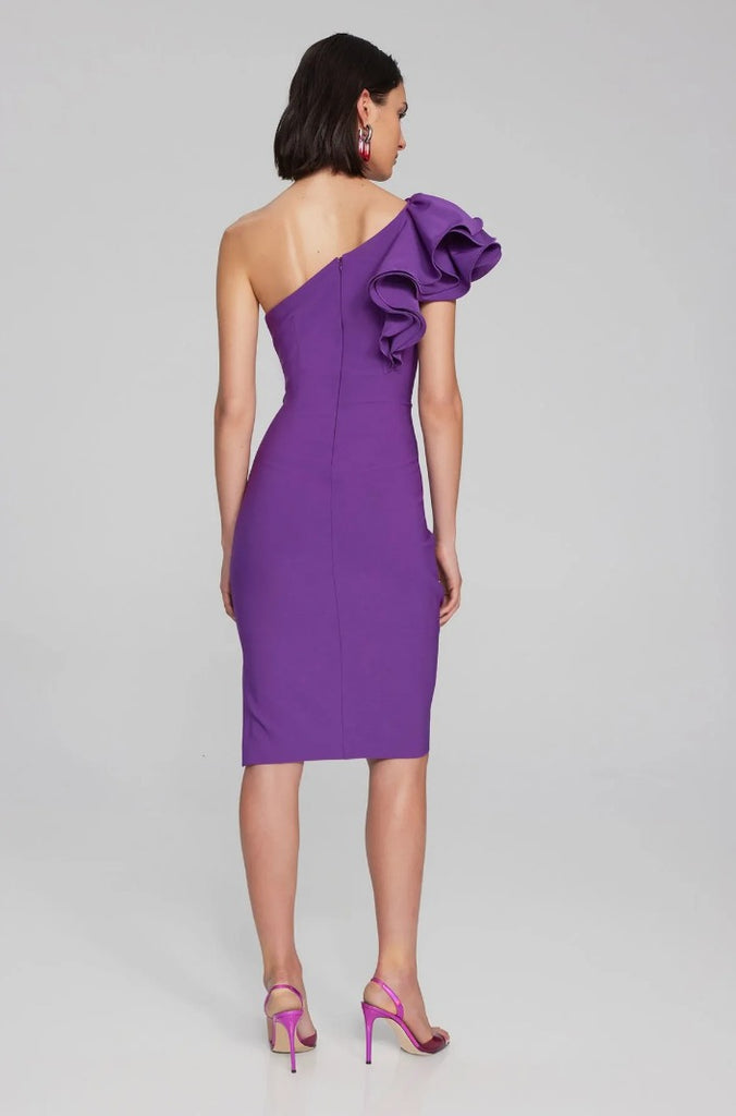 Experience effortless glamour with the Joseph Ribkoff Majesty One Shoulder Dress. The luxurious lux twill fabric showcases a playful yet sophisticated touch with its wire ruffle neckline. The back zipper closure and lining ensure a seamless fit and comfort. Perfect for upscale events, complete your look with heels and statement jewelry from the Signature Collection.