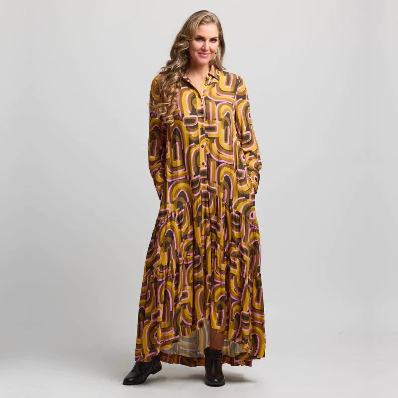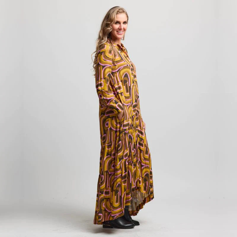 Relaxed fit floaty tiered dress with collar and button placket front through to hemline, side pockets and hi-lo hem.