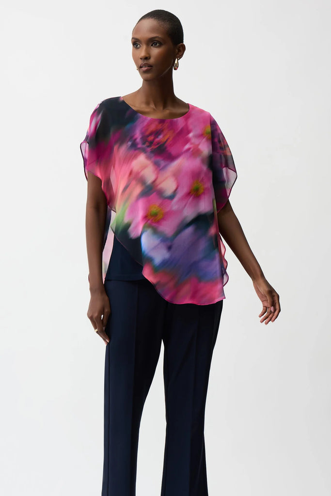 Layers of lightweight chiffon float over a silky knit camisole in this floral printed top. The asymmetrical hem and poncho-style short sleeves bring a relaxed elegance, finished with a scoop neckline and back keyhole.