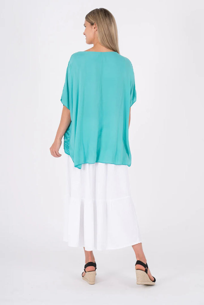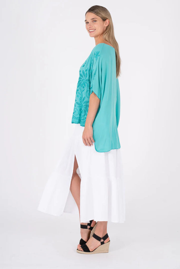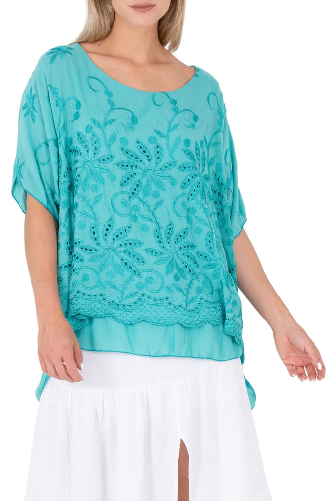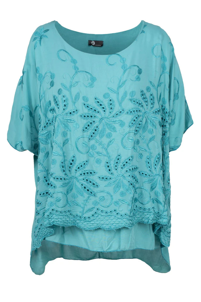Elevate your summer style with our M Label Blue Blouse. Made with a double layer of lightweight jersey and embroidered woven fabric, this top exudes elegance. The short sleeves and tonal embroidery add a touch of sophistication, making it perfect for any occasion. Experience luxury with this exclusive top.