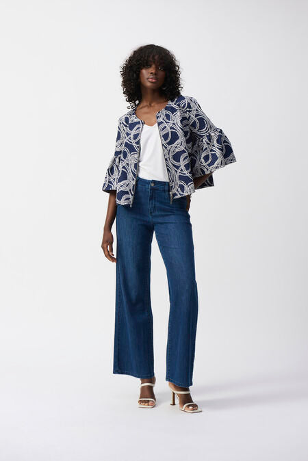 Elevate your wardrobe with the Joseph Ribkoff Navy + Off White Jacket. This hip-length top offers style and comfort with its abstract pattern, zipper closure, and round-neck design. The regular fit, bell-sleeve details, and feminine style make it perfect for all occasions. Made with a blend of 61% polyester and 39% cotton, it's both chic and practical for everyday wear.