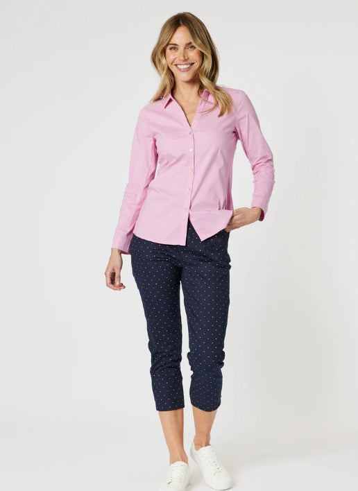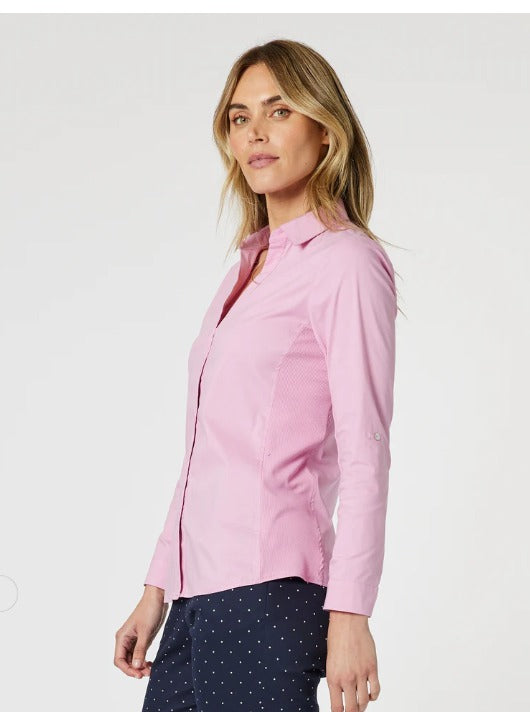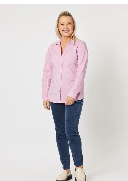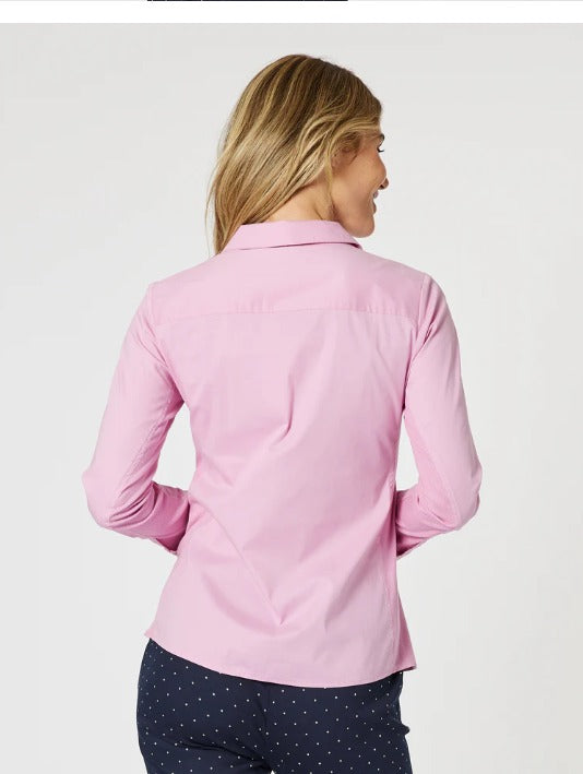 Stay stylish and comfortable all day long with the Gordon Smith Emma Orchid Top. Made with soft stretch cotton poplin fabric and featuring a unique cutaway collar and functional mother-of-pearl buttons, this best-selling shirt is a classic with a twist. The side ribbed detailing and versatile tab sleeves add to the overall sophisticated look. Available in multiple colors and true to size, it's a must-have for work, events, and weekend style.
