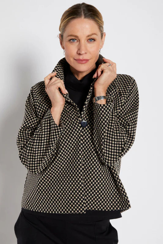 Make a statement in the Philosophy Diva Fly Crop Jacket. Made from a beautiful, lightweight textured fabric with a bit of stretch, this piece offers comfort while maintaining a clean, modern shape. The elevated collar and cropped length create a flattering silhouette that easily transitions from smart-casual to polished evening.